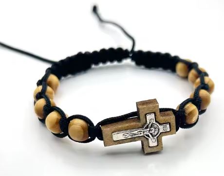 Catholic Cross Bracelet - Rosary Wooden Beads